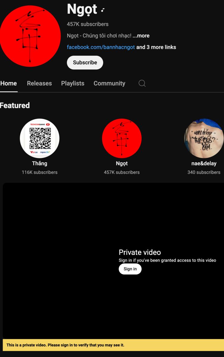 Theo đó, kênh YouTube là nơi Ngọt đăng tải các MV, ca khúc cũng như toàn bộ album phòng thu trong sự nghiệp. Tuy nhiên hiện tại, tất cả đã được ban nhạc ẩn đi mà không có bất kỳ thông báo cụ thể nào, khiến người hâm mộ không khỏi tiếc nuối.