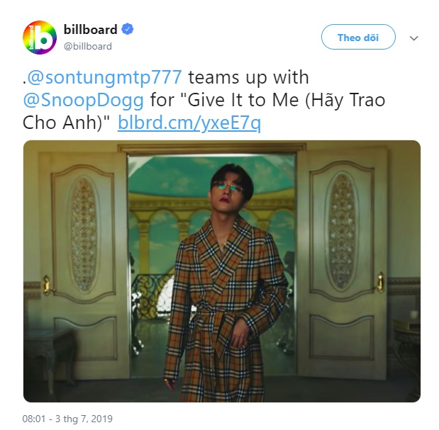 Trên trang twitter của Billboard cũng chia sẻ thông tin và thậm chí còn tag hai tài khoản twitter của rapper Snoop Dogg và Sơn Tùng.