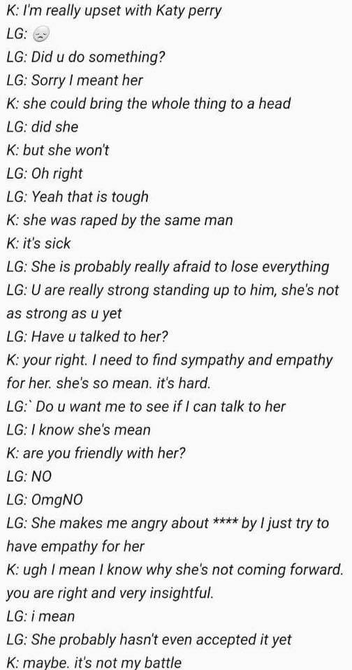 Cụ thể, trong đoạn chat được xem là bị phát tán từ chính tòa án nơi thụ lí vụ kiện của Kesha và Dr. Luke, Kesha đã nhắn tin cho Gaga và cảm thấy “rất buồn” vì Katy Perry, với lí do chính yếu là Katy Perry đã không chịu dũng cảm đứng ra làm chứng chống lại Dr. Luke, ngược lại cô ấy đã không đối diện với sự thật, để cho Kesha một mình chiến đấu. Đáp lời lại, Gaga trong đoạn chat trên cũng cho rằng Katy khá xấu tính và không thân thiện.