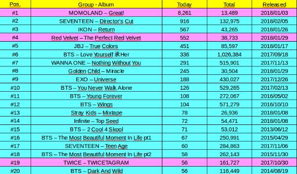Ngày 12/2, album Great! với ca khúc chủ đề BBoom BBoom của Momoland đã tẩu tán hơn 8000 bản trên Hanteo - BXH album hàng đầu Hàn Quốc.