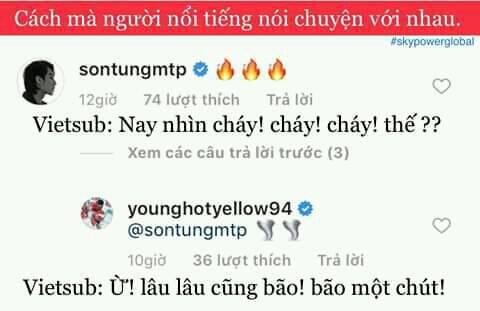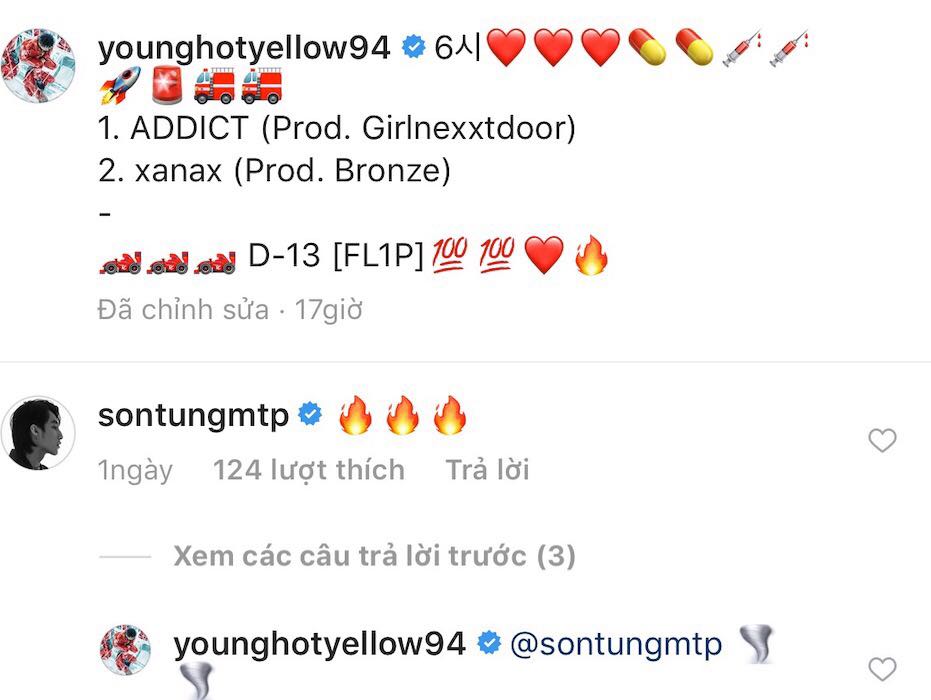 Dòng bình luận của Sơn Tùng khá ngắn ngọn, chỉ là biểu tượng 3 ngọn lửa, ngay lập tức anh chàng rapper trẻ tuổi người Hàn Quốc đã trả lời lại bằng biểu tượng 2 cơn lốc xoáy. Quả là ngôn ngữ của các… nghệ sĩ khi nói chuyện với nhau!