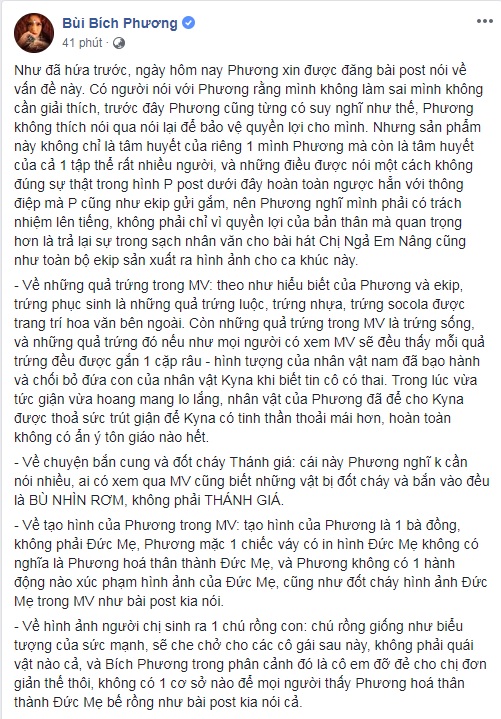 Mới đây, nữ ca sĩ Bích Phương vừa đăng tải một dòng trạng thái trên trang cá nhân thu hút sự quan tâm của cộng đồng mạng. Cụ thể, trong một bài post được lan truyền khắp mạng xã hội gây khá nhiều ồn ào xoay quanh những hình ảnh trong MV Chị ngả em nâng có mục đích tố cô cùng ekip đụng chạm tín ngưỡng tôn giáo khi đập trứng, bắn cung và đốt cháy thánh giá hay tạo hình gây tranh cãi của Bích Phương….