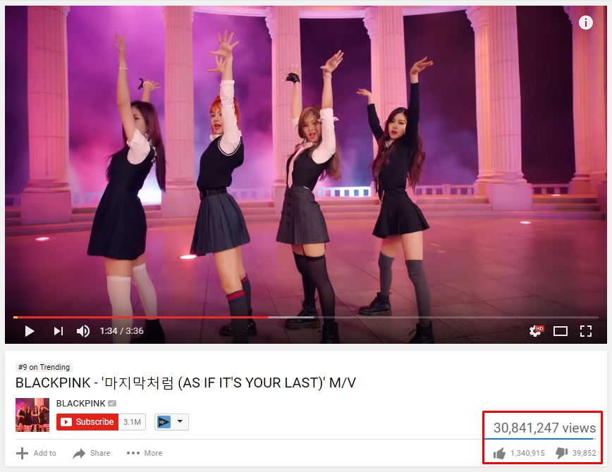Mới đây, Black Pink tiếp tục lập nên một thành tích ấn tượng mới với As If It’s Your Last khi trở thành nhóm nhạc Kpop cán mốc 30 triệu view nhanh nhất, chỉ trong 4 ngày và 11 giờ. Trước đó, TWICE là người nắm giữ kỷ lục này với Knock Knock trong 6 ngày.