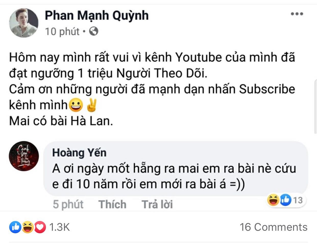 Cụ thể, Phan Mạnh Quỳnh đã chia sẻ trên trang cá nhân của mình về việc kênh Youtube đạt mốc 1 triệu người theo dõi, bên cạnh đó là lời hứa hẹn về ca khúc “Hà Lan” sẽ được ra mắt vào hôm sau. Tất nhiên đây là thông tin khiến người hâm mộ của nam ca sĩ vô cùng thích thú, hào hứng, tuy nhiên Hoàng Yến Chibi thì không hề cảm thấy “vui” vì điều này.