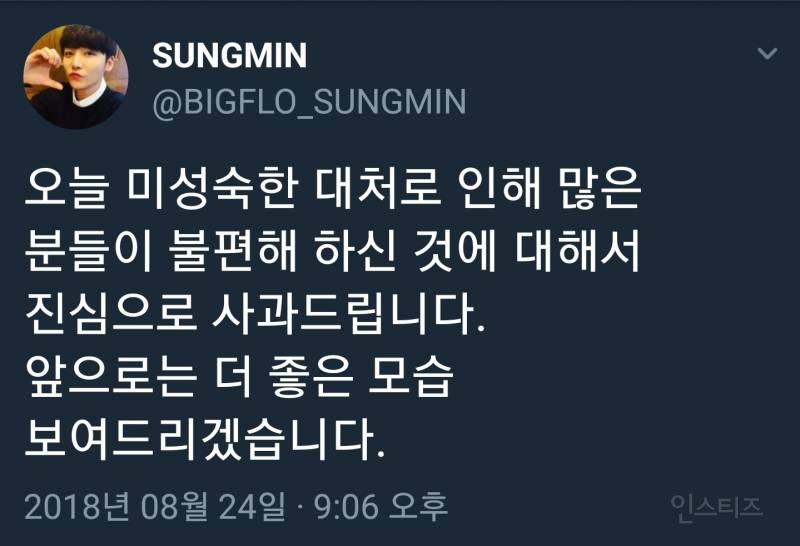 Nhận ra mình vừa gây tranh cãi nên Sungmin đã nhanh chóng gửi lời xin lỗi tới người hâm mộ qua tài khoản Twitter cá nhân. Tuy nhiên, dòng tin nhắn này lại tiếp tục khiến dư luận chia thành 2 phe, một bên thì cho rằng Sungmin chẳng cần thiết phải xin lỗi, phía còn lại thì vẫn tỏ ra không hài lòng về hành động “vượt mặt” Red Velvet.