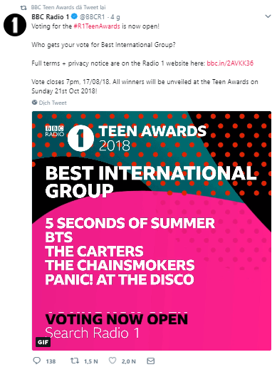 BTS được đề cử trong hạng mục Best International Group của giải thưởng BBC Radio 1’s Teen Awards 2018.