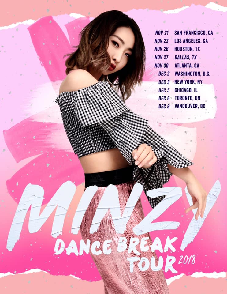 Tháng trước, Minzy vừa công bố tour diễn solo đầu tiên - Dance Break Tour, với các địa điểm tại Mỹ cà Canada vào cuối năm nay.