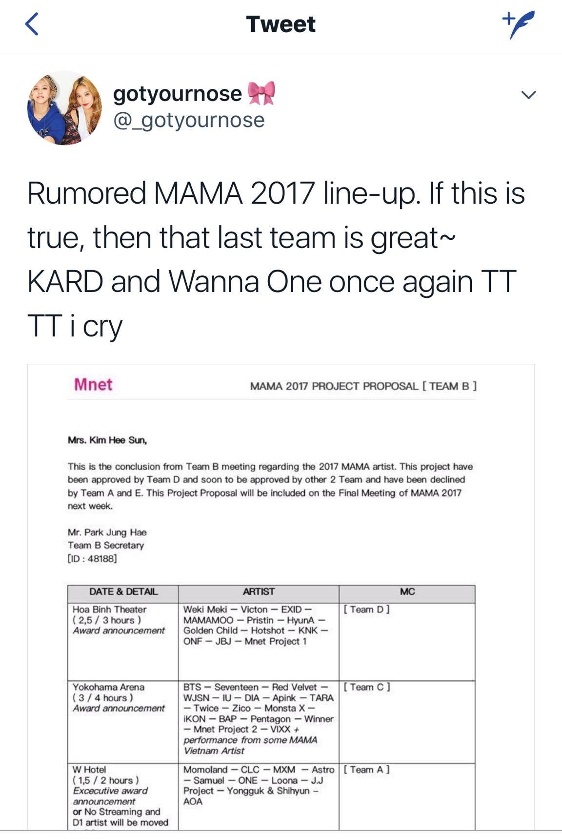 Và mới đây, 1 bức ảnh chưa rõ nguồn gốc nhưng đang lan truyền trên mạng với tốc độ chóng mặt về danh sách những nghệ sĩ sẽ tham gia tuần lễ MAMA khiến các fandom không thể làm ngơ. Theo như thông tin từ bức ảnh thì vào đêm 25/11 tại nhà hát Hoà Bình danh sách các nghệ sĩ sẽ quốc tế sẽ tham dự là: EXID, MAMAMOO, HyunA, Weki Weki, Pristin, Viction,…
