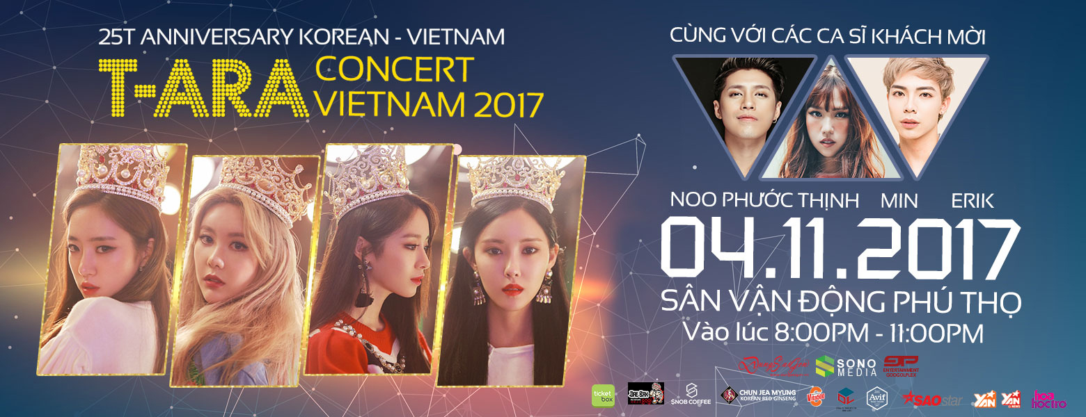 Vé xem T-ara concert tại Việt Nam sẽ được phát hành chính thức qua kênh https://ticketbox.vn/t-ara-concert-2017. Saostar hân hạnh là đơn vị bảo trợ truyền thông chính thức cho sự kiện này.