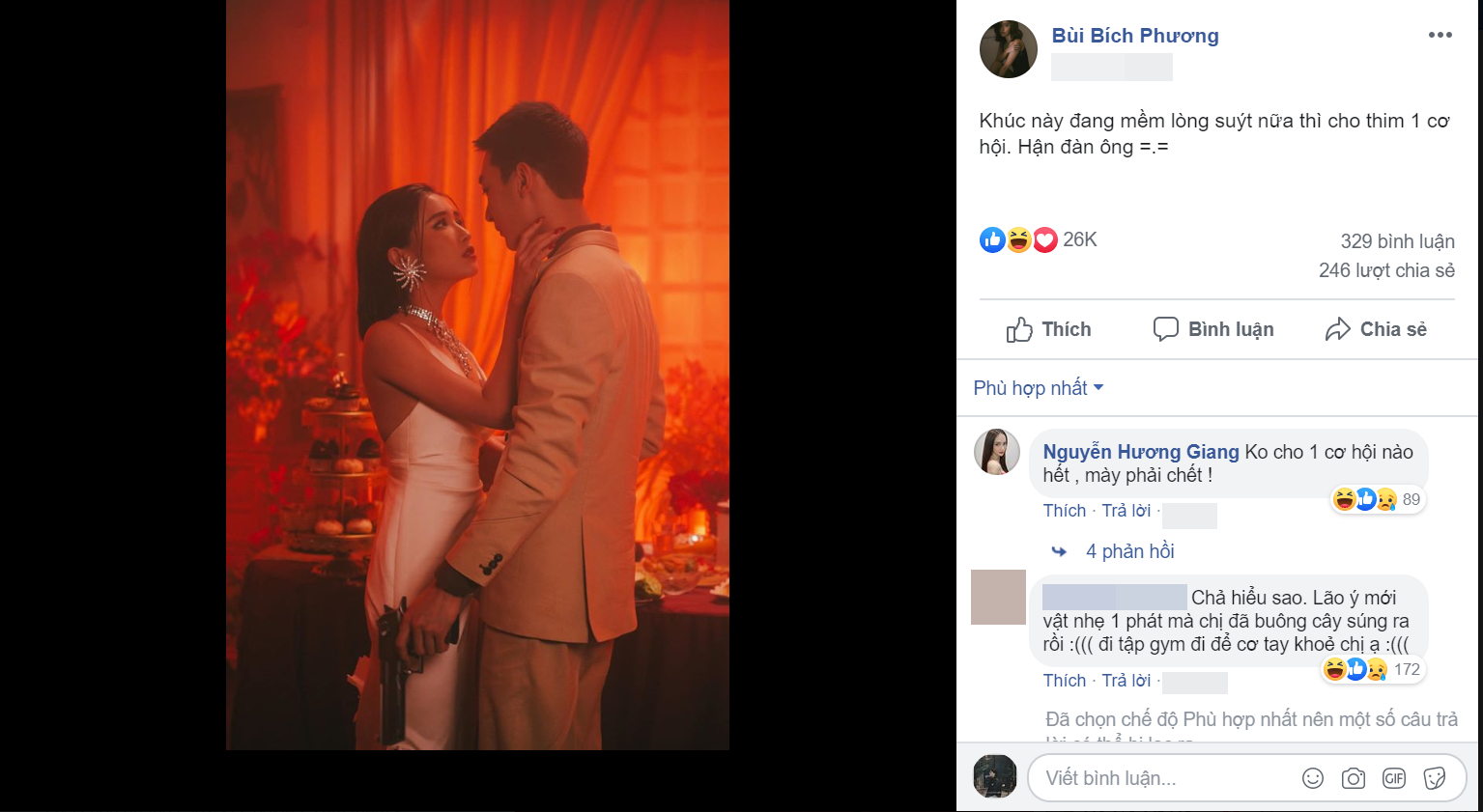 Bức ảnh của Bích Phương cũng không có gì quá đặc biệt để bàn tán nếu như không có sự xuất hiện của cô bạn thân Hương Giang. Hương Giang đã nhanh chóng đưa ra cao kiến để giúp Bích Phương trị người yêu ngoại tình, tránh trường hợp đi vào vết xe đổ trước đó. Cụ thể, Hương Giang đã bình luận: “Không cho 1 cơ hội nào hết, mày phải chết“.