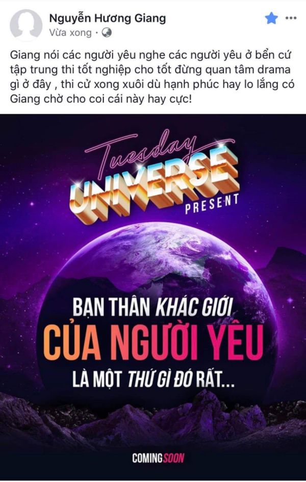 Trước đó, Hương Giang đã chính thức lên tiếng xác nhận về sản phẩm tiếp theo nằm trong dự án “Vũ trụ Thứ 3” (Tuesday Universe) của mình. Nữ ca sĩ đã bất ngờ thay mới avatar bằng câu slogan sắc mùi drama kèm dòng chữ coming soon: “Bạn thân khác giới của người yêu là một thứ gì đó rất…”, chưa cần biết sau dấu ba chấm kia sẽ là những gì nhưng khán giả cũng phần nào đoán được sẽ có một sản phẩm vô cùng “bão tố” sắp tới đây.