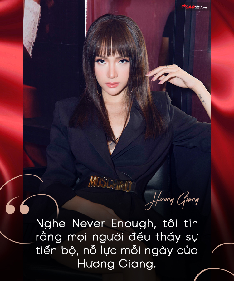 Nhưng với những người mà theo dõi từ bước đầu của Hương Giang thì họ sẽ cảm nhận được đây là một sự tiến bộ cũng như là nỗ lực của mình. Giang luôn ghi nhận những ý kiến đóng góp của tất cả mọi người. Cái gì chưa hay thì Giang sẽ coi đó là bài học cho bản thân còn may mắn đó là điều tốt thì mình sẽ lấy đó làm niềm vui cũng như động lực, một sự ủng hộ của khán giả dành cho mình.