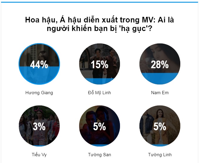 Sau khi bài viết Hoa hậu, Á hậu trổ tài diễn xuất trong MV: Ai là người khiến bạn bị 'hạ gục'? lên sóng, đã có rất nhiều độc giả tham gia bình chọn xem ai là người sở hữu khả năng diễn xuất “vạn người mê” nhiều nhất. Và người nhận được sự bình chọn dẫn đầu không ai khác chính là Hương Giang - Hoa hậu Chuyển giới Quốc tế và cũng là nữ ca sĩ sở hữu những bản hit gây “bão” mạng xã hội trong một khoảng thời gian khá dài.