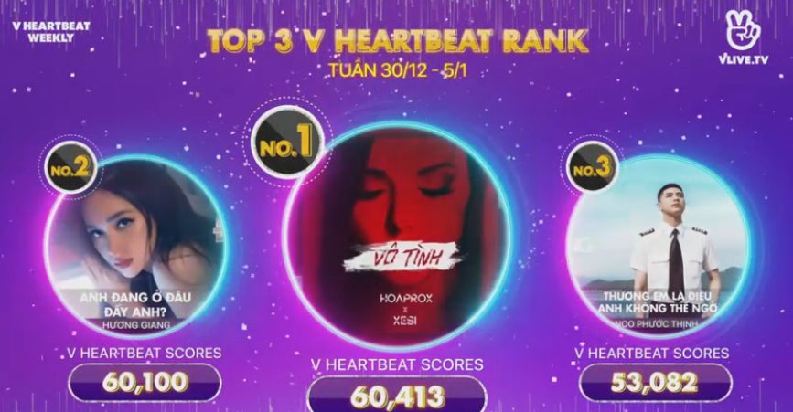 Giây phút hồi hộp nhất của V HEARTBEAT Weekly tuần này có lẽ là sự xuất hiện của 3 cái tên sẽ lọt vào Top 3. Những cái tên vô cùng thân quen nhưng lại thể hiện một sự “đấu đá” ngầm đó chính là Anh đang ở đâu đấy anh, Vô tình và Thương em là điều anh không thể ngờ. Cuối cùng, chiến thắng của V HEARTBEAT Weekly tuần này đã thuộc về Vô tình của Xesi.