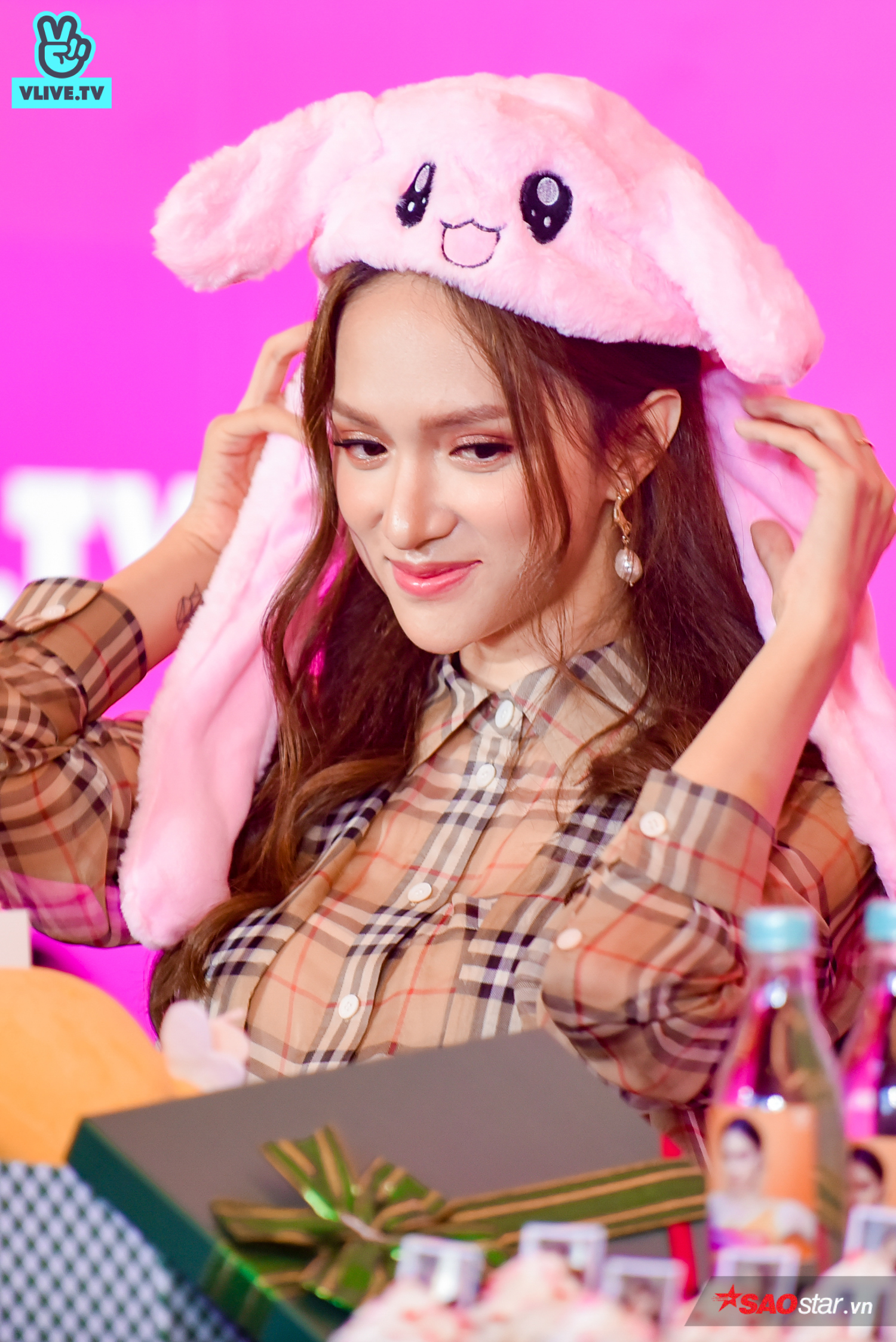 Xuất hiện tại buổi fansign, dù diện trang phục vô cùng đơn giản nhưng nét xinh đẹp của Hương Giang vẫn thu hút sự chú ý của hàng trăm fan có mặt. Đặc biệt, cô nàng còn chu đáo chuẩn bị nước và bánh để dành tặng cho các fan.