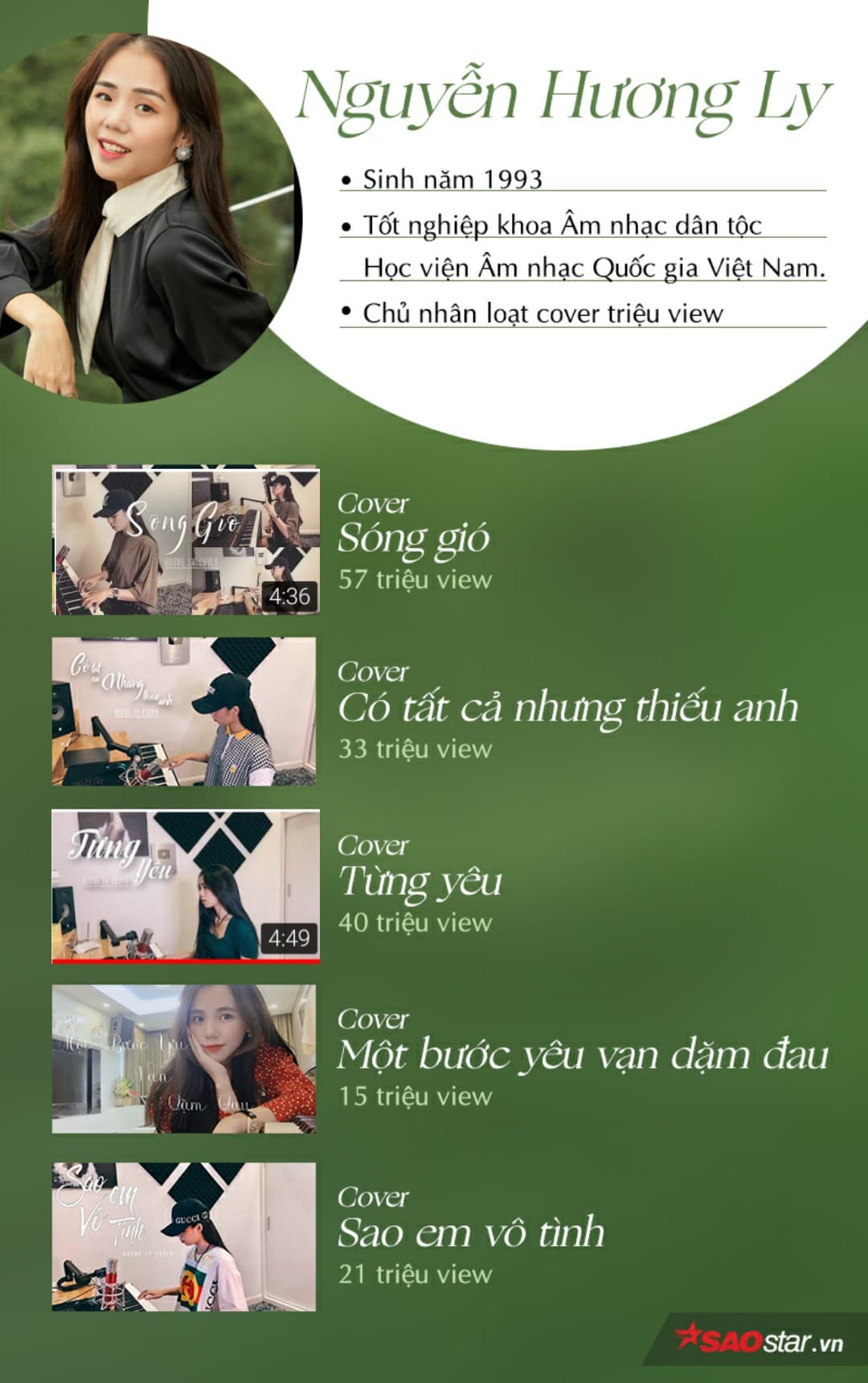 Hương Ly - “Thánh nữ cover” tên thật là Nguyễn Hương Ly (1993) sinh ra và lớn lên ở Hà Nội. Vốn xuất thân từ gia đình có truyền thống nghệ thuật nên từ nhỏ, Hương Ly đã sớm được tiếp cận với nhiều thể loại nhạc cụ, cũng từ đó tình yêu âm nhạc bắt đầu trỗi dậy. Không những vậy, Hương Ly còn theo học và tốt nghiệp tại khoa Âm nhạc dân tộc - Học viện Âm nhạc Quốc gia Việt Nam. Đây cũng là lí do cô nàng thường xuyên mang các loại nhạc cụ dân tộc vào những bản cover của mình.