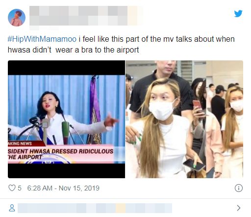 #HipwithMamamoo, tôi cảm nhận rằng đoạn MV này đang nói về tranh cãi khi Hwasa không mặc bra tại sân bay.