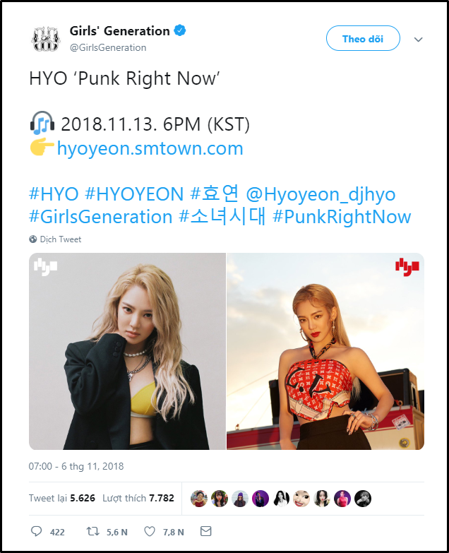 Có lẽ tháng 11 là chính là thời điểm hoạt động năng nổ nhất của SM Entertaiment từ trước đến nay khi công ty giải trí này bất ngờ tung hàng loạt “gà cưng” trở lại thị trường Kpop. Sau EXO, BoA, Key (SHINee), Hyoyeon (SNSD) sẽ ra nghệ sĩ tiếp theo ra mắt sản phẩm âm nhạc trong tháng này. Cụ thể, tối này 6/11, trang Twitter của SNSD đã đăng tải thông tin về kế hoạch comeback solo của Hyoyeon. Theo đó, sản phẩm trở lại này có tên là Punk Right Now sẽ được ra mắt người hâm mộ vào ngày 13/11 tới.