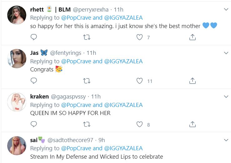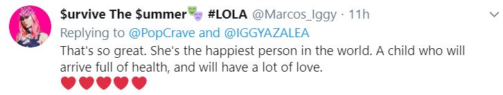 “Đây thật sự là một tin vui. Iggy là người hạnh phúc nhất thế giới. Con trai của cô ấy chắc chắn sẽ lớn lên mạnh khỏe và hạnh phúc thôi.“