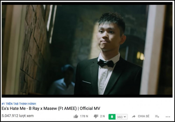 Sau 3 ngày ra mắt, MV Ex's Hate Me đã leo lên vị trí top 1 trending Youtube cùng hơn 5 triệu lượt xem. Từ “cú đà” này, khán giả đang rất mong chờ vào sự kết hợp tiếp theo đến từ B Ray cũng như “phù thủy âm thanh” Masew trong thời gian tới.