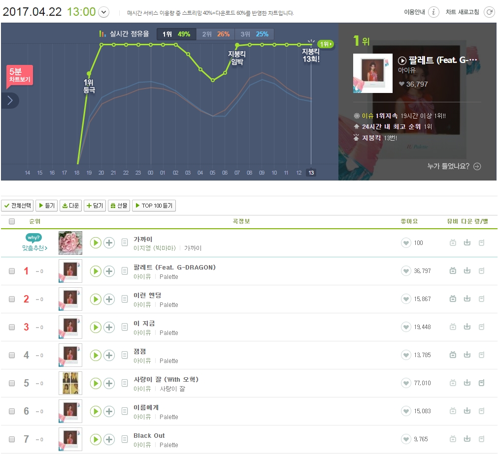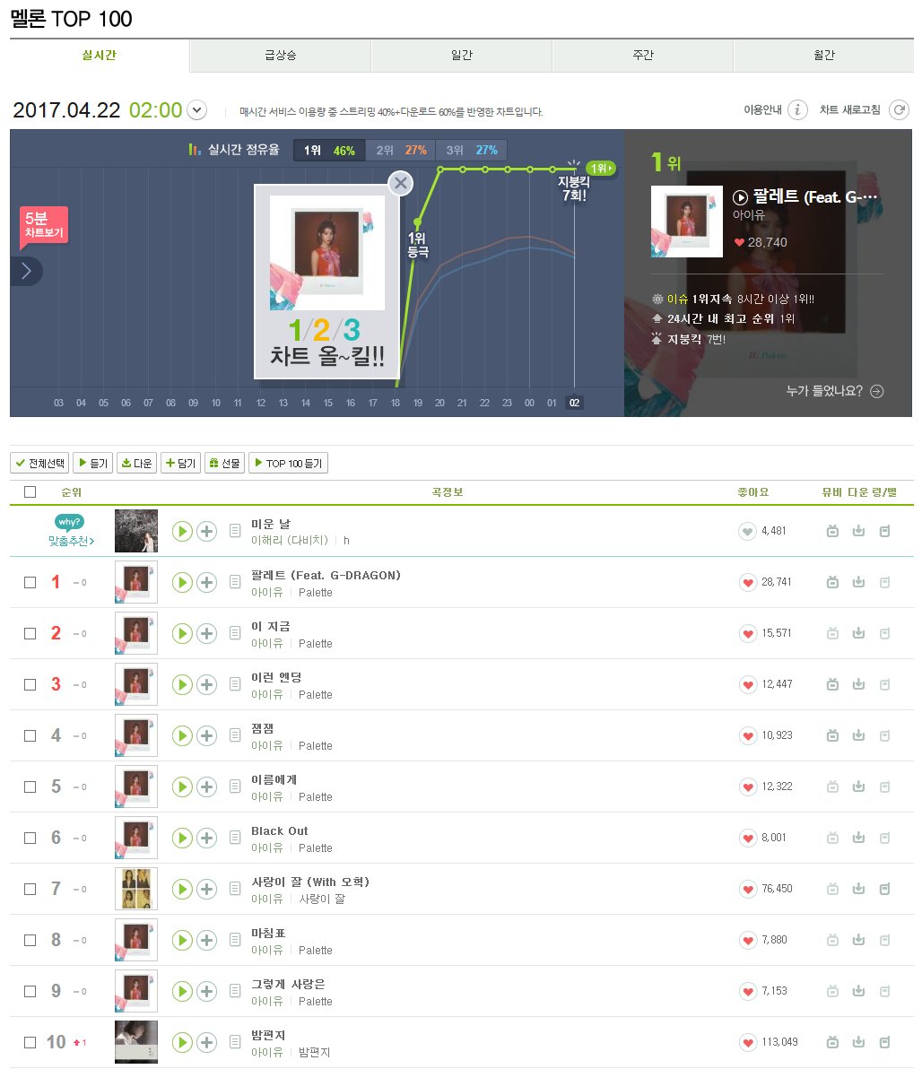 Chiều 21/4, “bom tấn” hạng nặng Palette - album thứ tư của IU và đồng thời là tên ca khúc chủ đề có sự góp giọng của G-Dragon đã chính thức lên sàn trong sự háo hức tột độ của các Kpop fan. Không ngoài dự đoán, Palette nhanh chóng all-kill sạch các BXH. Các ca khúc còn lại trong album cũng nhẹ nhàng xếp thành một hàng dài. Và chắc chắn, sức công phá của IU sẽ còn kéo dài trong thời gian tới. Thật khổ thân những trai xinh gái đẹp nào đang quảng bá ca khúc mới ở thời điểm này!