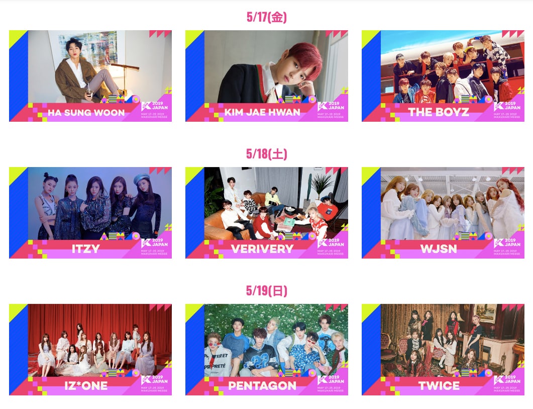 Cụ thể hơn, theo danh sách được thông báo, mỗi ngày tổ chức sự kiện có thêm 6 nghệ sĩ, nhóm nhạc tham dự. Trong đó, ngày 17/5 là sự xuất hiện của Ateez, Ha Sung Woon, IZ*ONE, Momoland, Kim Jae Hwan, The Boyz; ngày 18/5 là Chung Ha, ITZY, Monstar X, ONF, Veerivery, WJSN và ngày 19/5 sẽ có sự góp mặt của GWSN, IZ*ONE, Oneus, Pentagon, SF9, Twice.