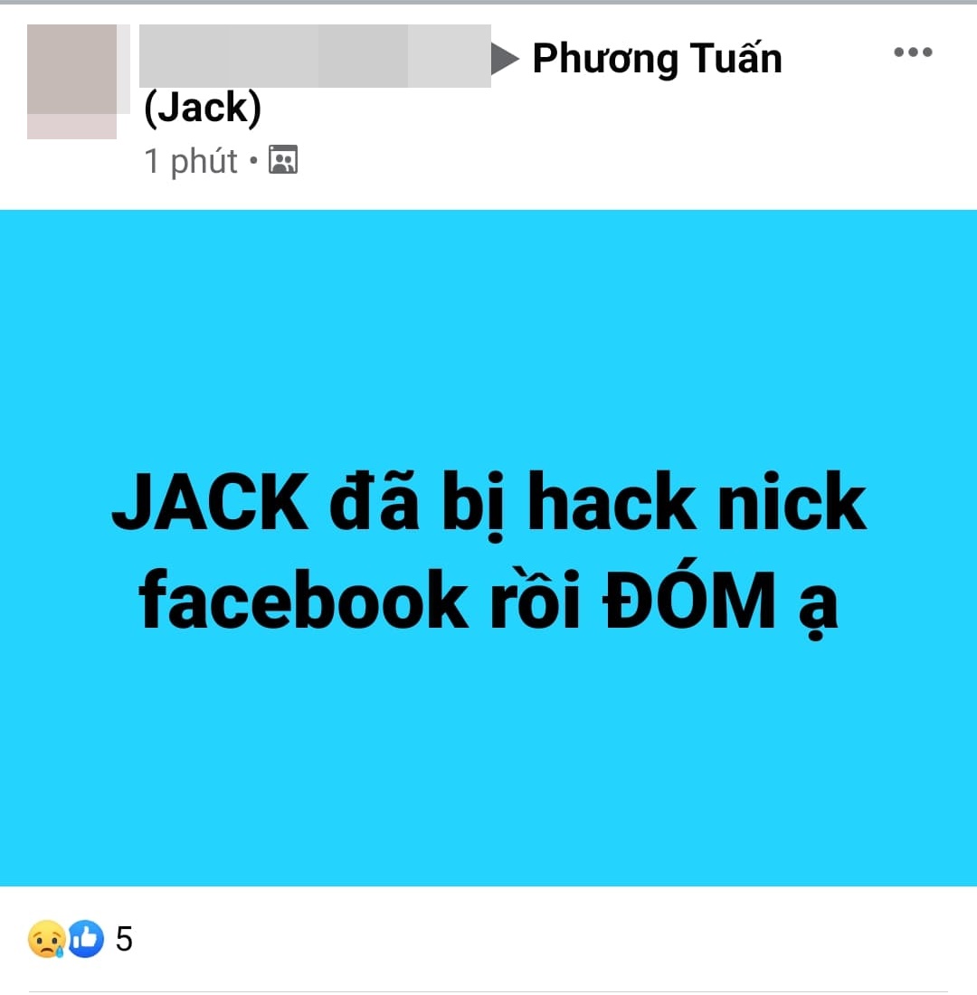Sau khi khiến người hâm mộ “sung sướng” vì màn tái xuất với MV Là 1 thằng con trai, thì mới đây, Jack bất ngờ gặp sự cố liên quan đến tài khoản mạng xã hội. Cụ thể, nick Facebook cá nhân của Jack đã “bay màu” không chút dấu vết trong sự hoang mang của người hâm mộ. Hiện tại, khi tìm kiếm thông tin về Jack trên Facebook thì chỉ có những kết quả liên quan đến Fanpage, nhóm riêng tư và rất nhiều tài khoản ảo.