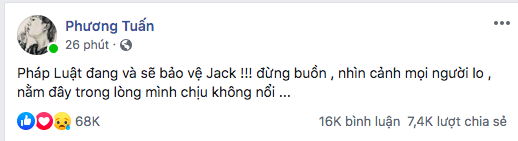 Cách đây ít phút, sau khi phía K-ICM chính thức lên tiếng về lùm xùm với Jack thì nam ca sĩ sinh năm 1997 cũng đã đăng đàn “phản pháo” bằng status tiếp theo. “Pháp Luật đang và sẽ bảo vệ Jack !!! đừng buồn , nhìn cảnh mọi người lo , nằm đây trong lòng mình chịu không nổi …” - Jack cho hay. Chia sẻ của Jack lập tức nhận được sự quan tâm lớn từ fan và cư dân mạng.