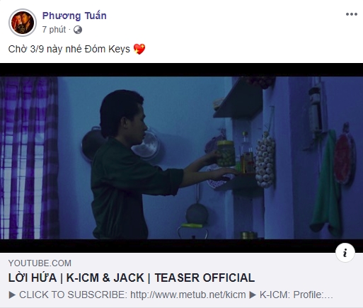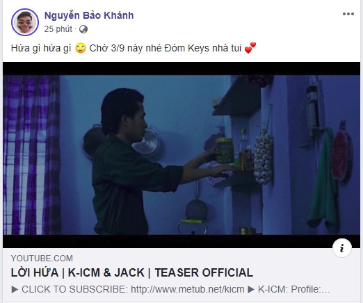 Cách đây ít phút, cộng đồng fan của Jack và K-ICM như được một phen “nhốn nháo” hơn bao giờ hết khi anh chàng Jack bất ngờ “đánh úp” fan với Teaser Official mang tên Lời hứa. Điều này khiến người hâm mộ vô cùng bất ngờ và đặt nghi vấn liệu MV Sóng gió còn chưa kịp nguội thì một sản phẩm âm nhạc khác sẽ được Jack và K-ICM tung ra vào ngày 3/9? Bên dưới phần bình luận, hàng loạt bình luận của fan đang bày tỏ sự háo hức và chờ đợi với sản phẩm đầy “bí ẩn” này.
