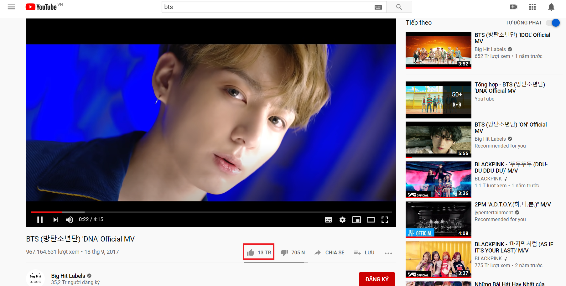 Còn với nhóm BTS, MV DNA tiếp tục đạt lượt like mới khi con số chạm mốc 13 triệu. MV DNA đánh dấu màn comeback bùng nổ trong năm 2017 của BTS được lên sóng ngày 18/9. Với thời gian này, BTS mất hơn 2 năm để MV DNA đạt 13 triệu like. Đây là MV thứ 2 của nhóm có số lượt like vượt qua con số 13 triệu, trước đó là Boy With Luv. Và với 2 MV đạt 13 triệu like, BTS là nghệ sĩ đầu tiên và duy nhất trên thế giới làm được điều này.