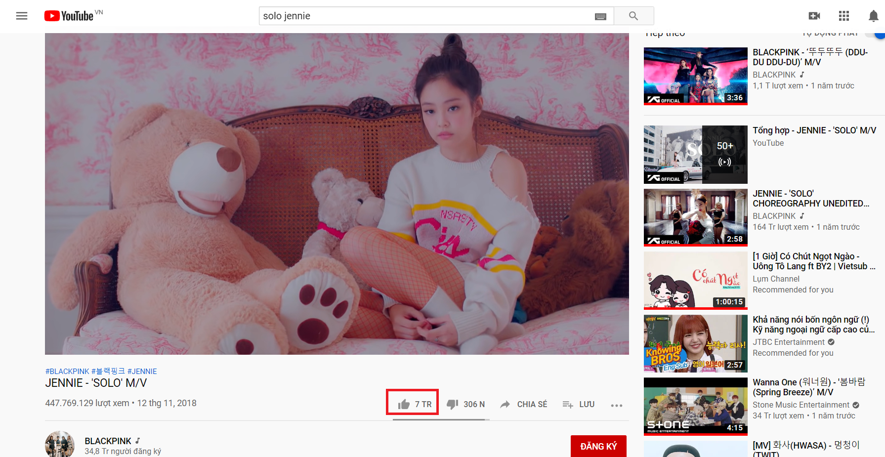 Theo đó, cả Jennie (BlackPink) và BTS cùng gặt hái thành tích mới ở mảng lượt like trên Youtube với 2 MV SOLO và DNA. Đối với Jennie (BlackPink), màn debut solo trong năm 2018 cùng ca khúc SOLO một lần nữa chứng minh sức hút của mình khi chính thức cán mốc 7 triệu lượt like. MV được cô nàng phát hành vào ngày 12 tháng 11 năm 2018, có nghĩa Jennie chỉ mất chưa đến 1,5 năm để có được con số ấn tượng này. Đặc biệt hơn, Jennie cũng là nữ nghệ sĩ solo Kpop đầu tiên có MV vươn đến lượt like này.