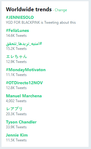 Từ khóa “JENNIESOLO” #1 top trending toàn thế giới, hashtag “Jennie Kim” cũng giữ vị trí thứ 9.