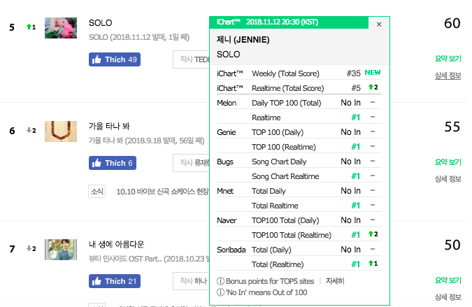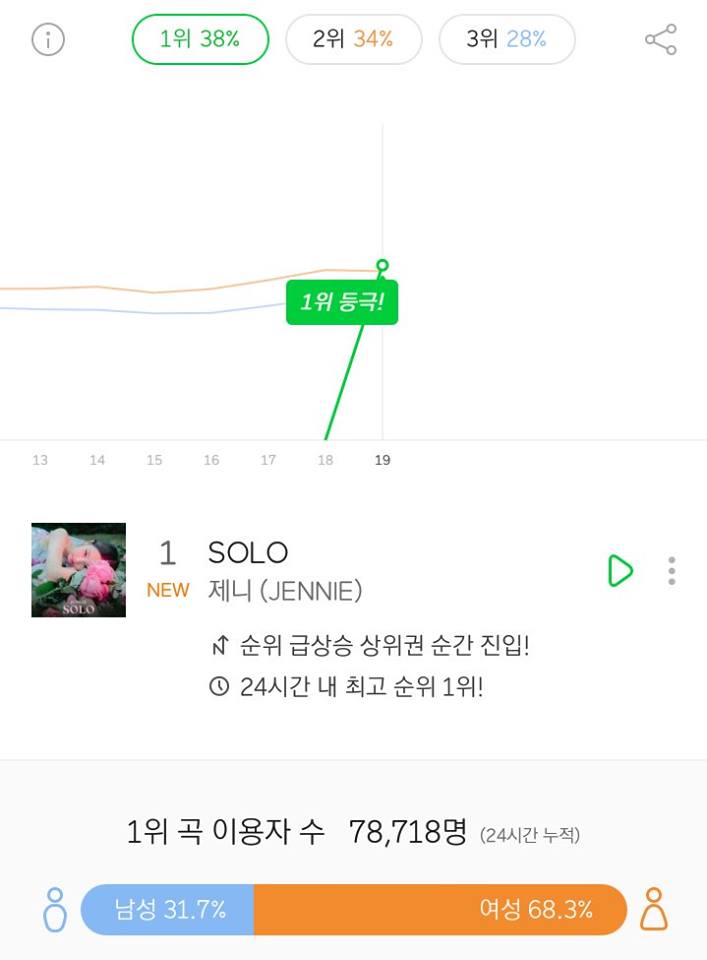 Trước thành tích “khủng” này, SOLO của Jennie còn “bỏ túi” loạt thành tích khác như: lọt top 3 bài hát của nghệ sĩ solo có lượt người nghe độc nhất cao nhất sau giờ đầu ra mắt trên trang nhạc MelOn (sau BBIBBI và Palette của IU), đạt realtime all-kill khi giữ vị #1 trên 6 trang nghe nhạc uy tín của Hàn Quốc chỉ sau 2 giờ phát hành, hashtah #JENNIESOLO #1 top trending toàn thế giới hơn 1 tiếng, #1 iTunes ở 31 quốc gia và vùng lãnh thổ,…