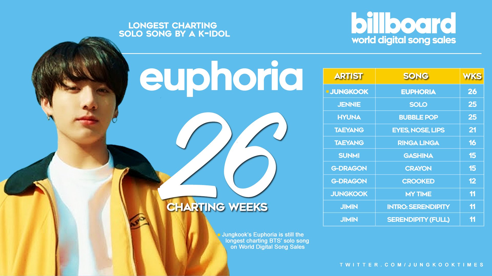 Theo đó, Jungkook đã đạt kỉ lục mới trên BXH Billboard World Digital Song Sales nhờ ca khúc solo Euphoria của mình. Euphoria của Jungkook tiếp tục có mặt tại BXH Billboard World Digital Sales tuần này giúp cho ca khúc đạt tổng cộng 26 tuần xếp hạng trên BXH này. Ca khúc Euphoria được phát hành vào ngày 24 tháng 8 năm 2018 với album Love Yourself: Answer, có nghĩa anh chàng mất gần 2 năm để đạt được 26 lần xuất hiện trên BXH Billboard World Digital Song Sales. Sở hữu giai điệu, tiết tấu bắt tai và hơn hết là thể hiện rõ chất giọng tuyệt vời của em út BTS Jungkook, Euphoria đã được đông đảo khán giả đón nhận.