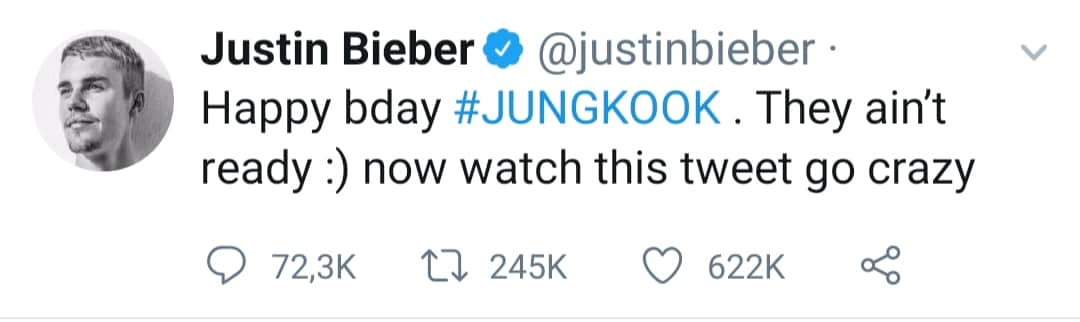 Mới đây, người hâm mộ của Justin Bieber và Jungkook (BTS) đang “rần rần” trước một màn tương tác “khủng” trên mạng xã hội của hai nhân vật này. Cụ thể, Justin Bieber đã bất ngờ đăng một dòng tweet chúc mừng sinh nhật thành viên Jungkook của nhóm nhạc BTS với nội dung: “Chúc mừng sinh nhật Jungkook. Các bạn vẫn chưa được sẵn sàng đâu. Cái tweet này sẽ làm nhiều người phải bất ngờ vì những điều điên rồ đấy”. Có thể thấy, đây dường như không chỉ đơn thuần là một lời chúc mừng sinh nhật thông thường mà khả năng cao Justin Bieber đang ngấm ngầm thông báo cho một màn collab với Jungkook chăng?