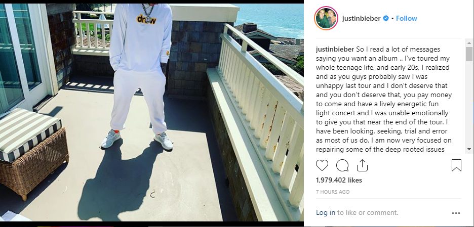 Mới đây, Justin Bieber đã khiến các Beliebers nói riêng và toàn bộ khán giả thế giới nói chung hoàn toàn bất ngờ và sửng sốt khi tuyên bố sẽ tạm dừng sự nghiệp âm nhạc của mình trong thời gian ngắn. Thông qua một bức ảnh trên Instagram, nam ca sĩ Boyfriend đã cho đăng tải một bức tâm thư tương đối dài, bộc bạch rất nhiều nỗi niềm khiến người hâm mộ không thể kìm lòng.