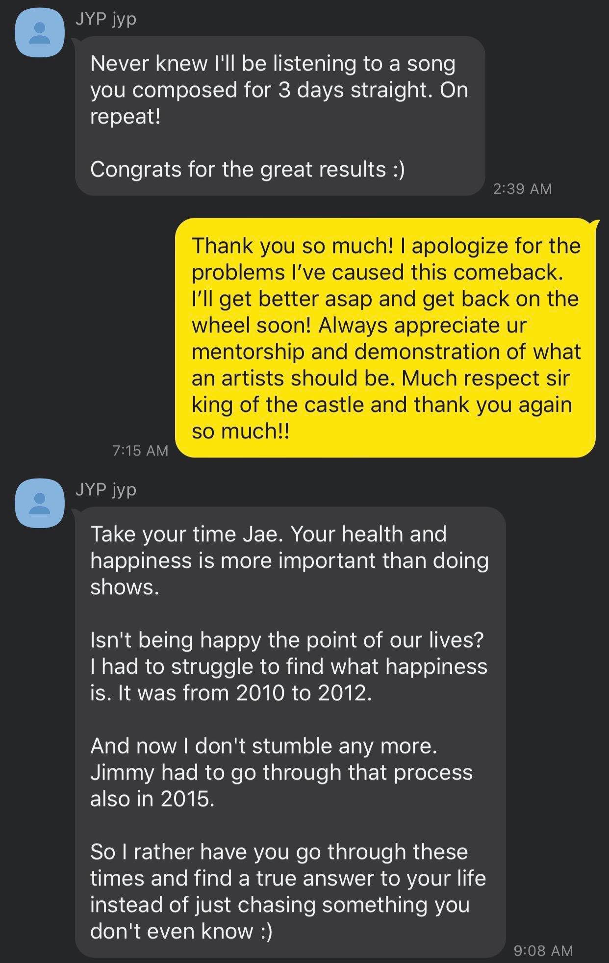 Sau khi thông báo tạm dừng hoạt động, thành viên Jae đã đăng tải đoạn tin nhắn trò chuyện giữa mình và chủ tịch Park Jin Young, nội dung đoạn tin nhắn đó là chủ tịch JYP khen các ca khúc trong album của DAY6, cùng với đó là thể hiện sự quan tâm về sức khỏe của các chàng trai, đặc biệt là câu nói: “Cứ từ từ thôi nào. Sức khỏe của các cậu quan trọng hơn việc chạy show” đã khiến cộng đồng người hâm mộ của DAY6 nói riêng và Kpop nói chung không khỏi ấn tượng trước cách chủ tịch JYP quan tâm đến nghệ sĩ của mình.