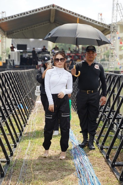 Khoảng hơn 1 giờ trưa, Suni Hạ Linh trong bộ trang phục jean mix cùng giày thể thao và crop top xanh lá năng động, trẻ trung cũng có mặt tại sân khấu.