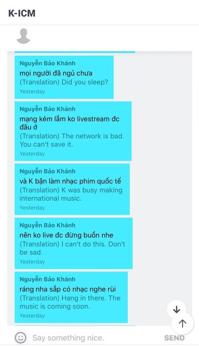 Cụ thể, trong một nhóm chat trên ứng dụng online, K-ICM đã tiết lộ rằng ngày hôm đó do mạng quá kém nên không thể livestream được. Đồng thời anh cũng nhận được một email “đặt hàng” cho dự án nhạc phim quốc tế thế là lập tức ùa vào làm việc ngay. K-ICM cũng cho biết hiện tại anh đang rất bận thế nên những buổi livestream làm nhạc mỗi tối như trước đây chưa biết có thể tiếp tục thực hiện hay không.
