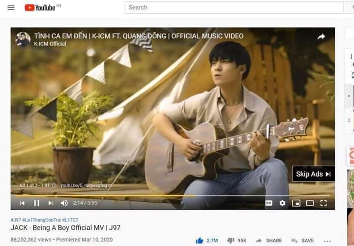 Được biết MV Tình ca em đến của K-ICM vừa ra mắt cách đây không lâu và tiếp tục chịu chung số phận “dislike đè bẹp like” như các sản phẩm trước đó. Tuy nhiên, MV vẫn “vớt vát” được đôi chút khi đã lăm le vào top trending Youtube, một tín hiệu đáng mừng cho K-ICM và Quang Đông. Tuy nhiên, nhiều người cũng đang đặt ra nghi vấn rằng việc sản phẩm mới của K-ICM có sự khởi sắc phải chăng một phần nhờ vào việc chạy quảng cáo khắp nơi?