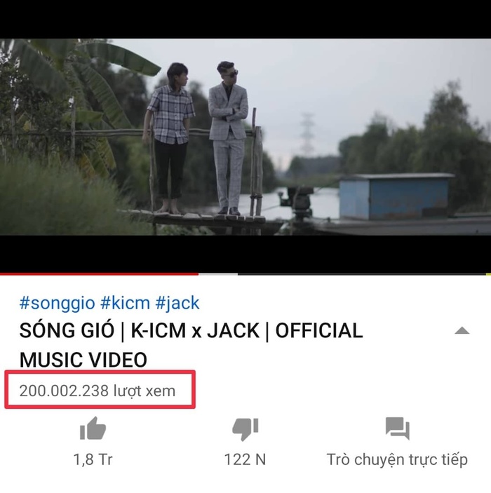 Gần đây nhất, MV Sóng gió của K-ICM và Jack chính thức cán mốc 200 triệu lượt xem. Điều đáng nói rằng bộ đôi producer - ca/nhạc sĩ chỉ mất đúng 102 ngày để sản phẩm âm nhạc này đạt số view khổng lồ. Đưa Sóng gió trở thành MV Vpop đạt 200 triệu lượt xem trên Youtube nhanh nhất trong lịch sử. Về thứ hai cũng lại là một “bom tấn” khác từ K-ICM và Jack: Bạc phận - MV cần 132 ngày để cán mốc 200 triệu lượt xem.