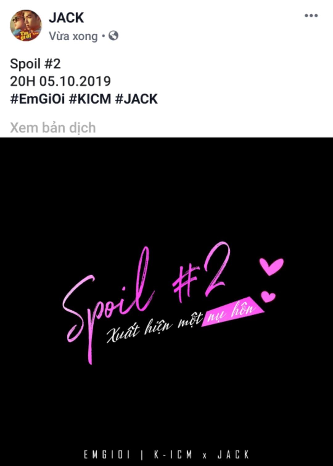 Tối ngày 2/10, K-ICM và Jack tiếp tục khiến cộng đồng Đóm - Keys sục sôi khi tung ra #2 spoil cho MV Em gì ơi đang cận kề ra mắt. Cụ thể, bộ đôi đình đám này đã bật mí về nụ hôn cực nóng sẽ xuất hiện trong MV Em gì ơi, tuy nhiên đó là nụ hôn của ai với ai thì vẫn còn là một ẩn số.