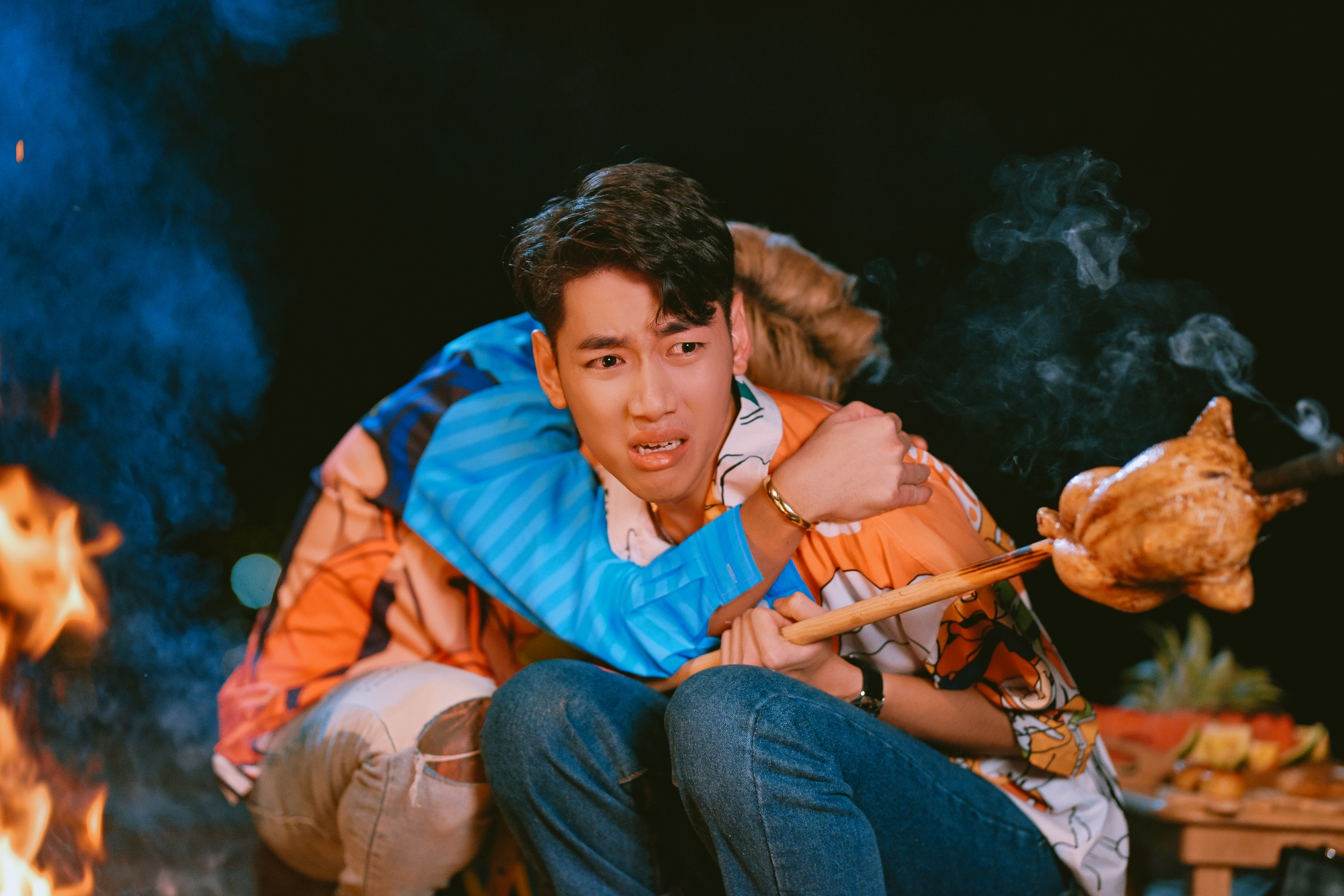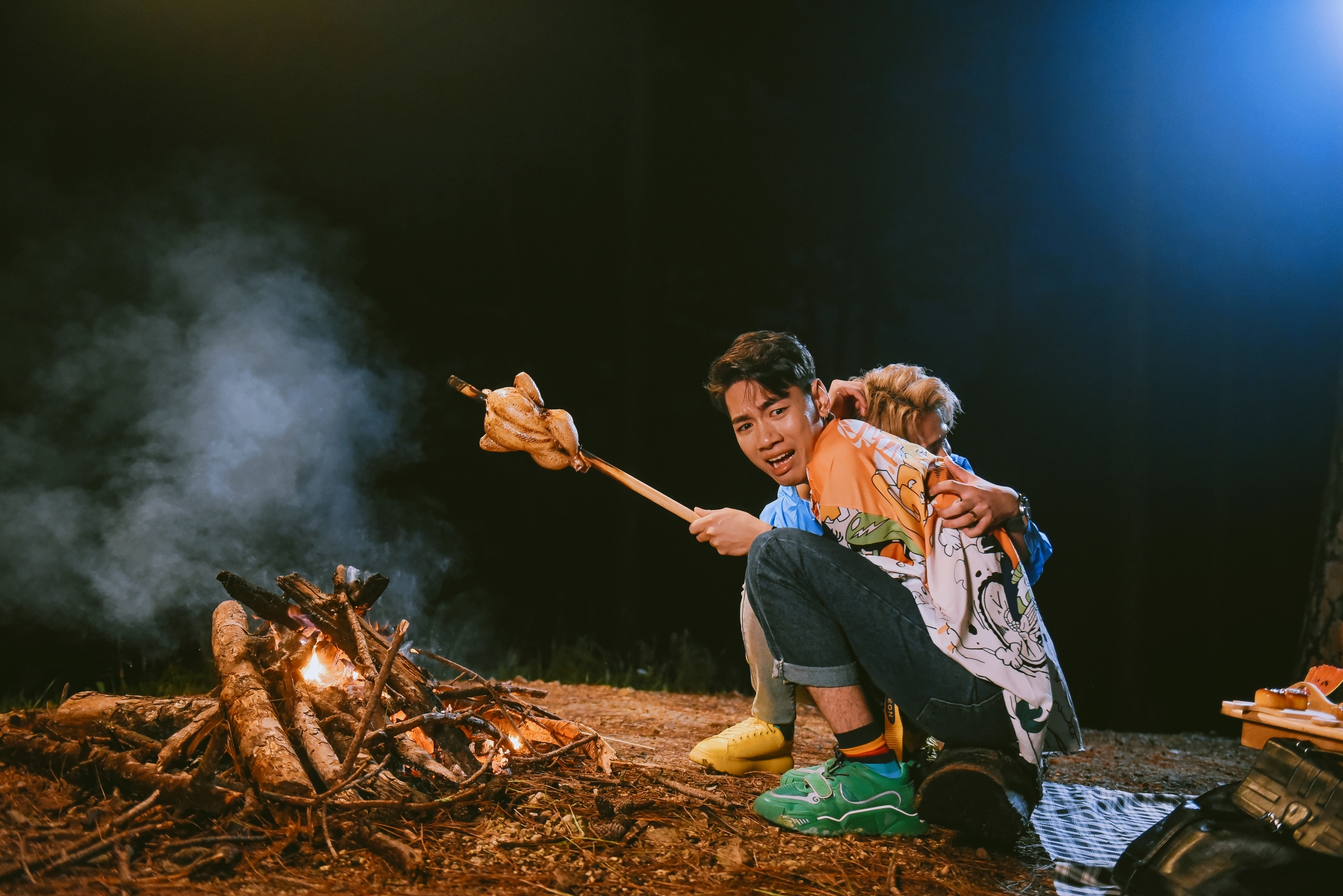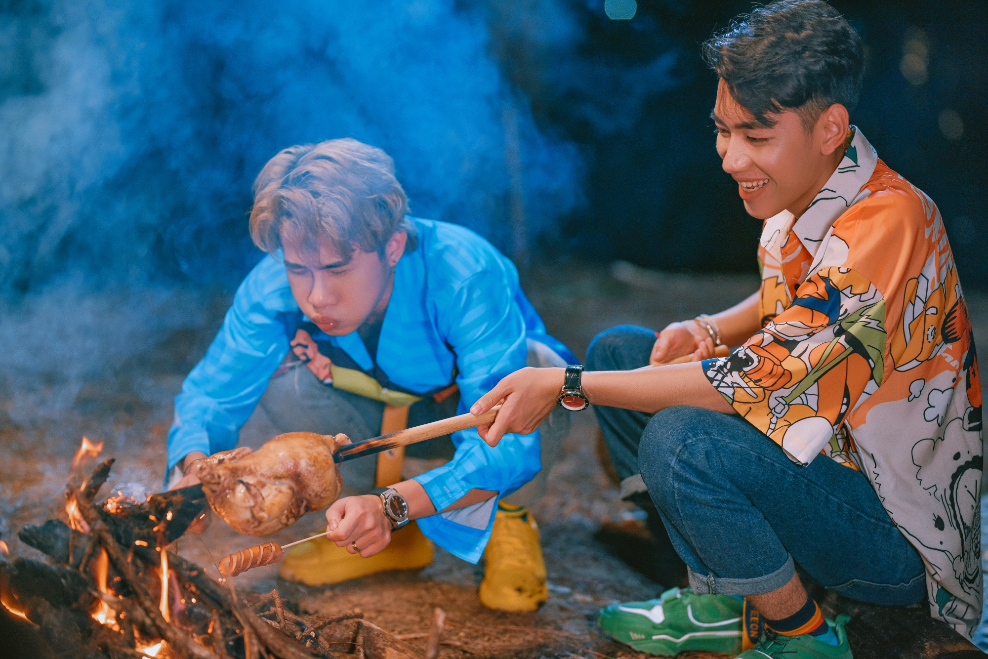K-ICM và Jack đang hí hửng nướng đồ ăn trên bếp lửa hừng hực.
