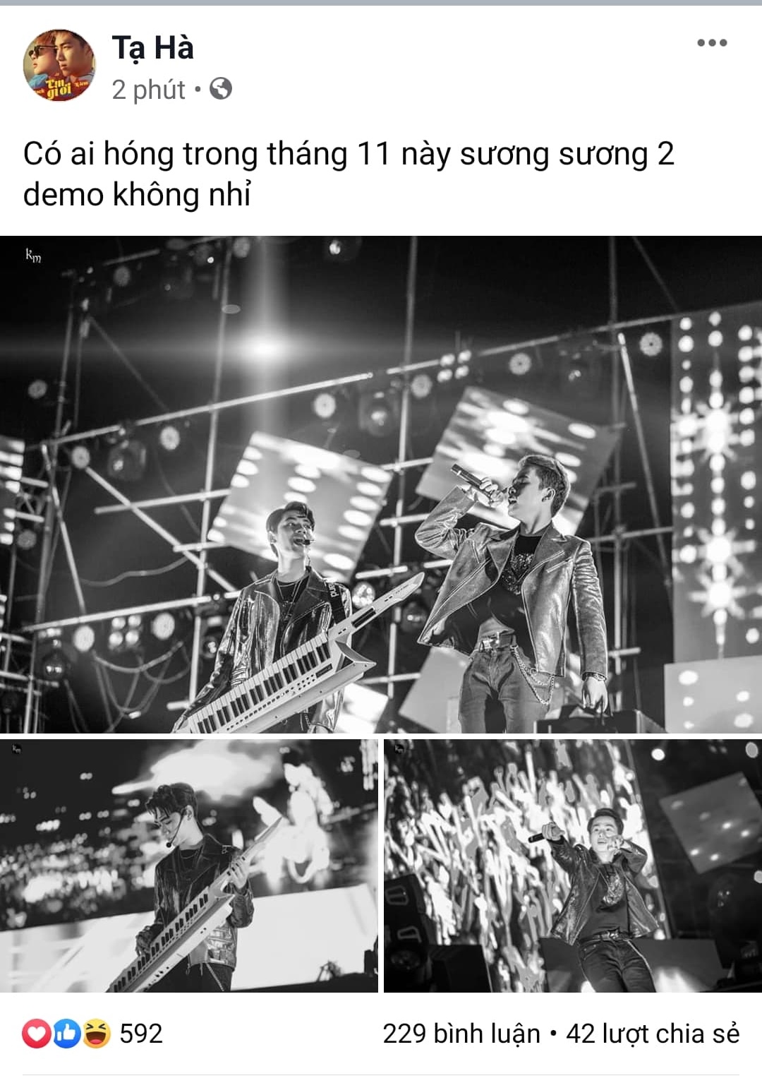 Cụ thể, chia sẻ trên trang Facebook cá nhân của mình, quản lý K-ICM và Jack đã đăng tải một vài bức ảnh của bộ đôi này cùng với một dòng caption gãy gọn nhưng lại vô cùng dễ gây “kích động”: “Có ai hóng trong tháng 11 này sương sương 2 bản demo không nhỉ?”. Với quả thính chất lượng này thì tất nhiên cộng đồng người hâm mộ của K-ICM và Jack đã không thể nào ngồi yên, hàng loạt những bình luận thi nhau xuất hiện như “vũ bão” để… đòi bằng được nhạc ra sớm sớm.