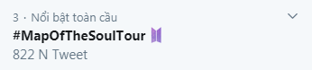 Dù chưa phát hành album mới, nhưng BTS đã thể hiện sức nóng của mình khi tung lịch trình về concert mới. Rất nhanh chóng, hashtag #MapOfTheSoulTour đã leo lên vị trí thứ 3 trong Top Trending Toàn cầu. Với quy mô lớn của concert lần này, BTS hứa hẹn sẽ mang đến những kỷ lục mới về doanh số. Điều này càng khiến ARMY háo hức mong chờ vào sự trở lại lần này của các chàng trai.