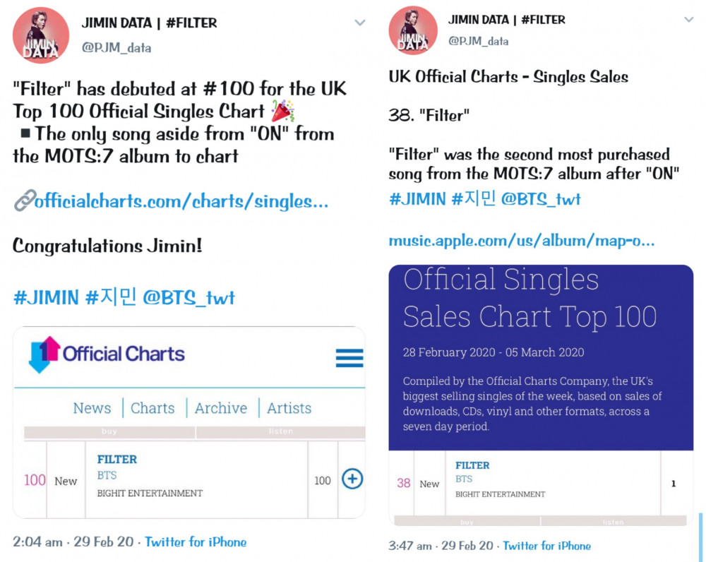 Thành công này đã giúp Jimin trở thành nghệ sĩ Hàn Quốc đầu tiên sau PSY sở hữu ca khúc solo có mặt trong UK Top 100 Official Singles Chart. Điều này có nghĩa rằng Fliter là ca khúc Kpop thứ 3 sau Gangnam Style và Gentleman có mặt trong BXH này. Tuy nhiên khác với PST, ca khúc của Jimin thậm chí còn không có MV hay bất kỳ quảng bá nào.