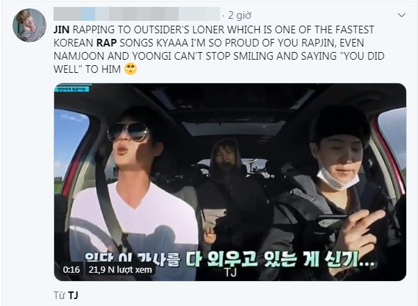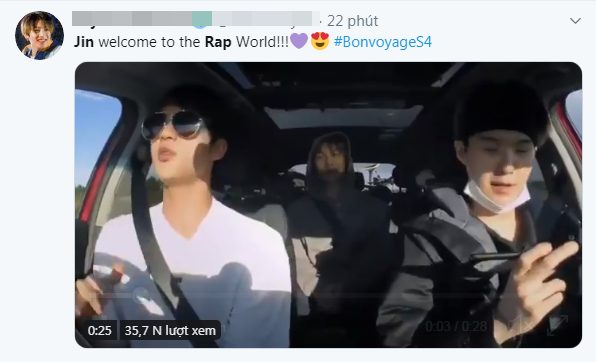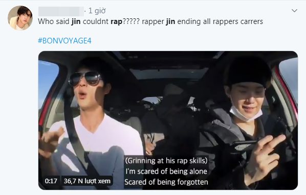 Trong tập mới nhất của Bon Voyage mùa 4, khi ngồi trên xe cùng 2 Rapper của nhóm là RMSuga, Jin đã cao hứng khi trổ tài bắn rap khiến không chỉ các fan hâm mộ mà ngay cả 2 người em của mình cũng phải bật cười bất lực.