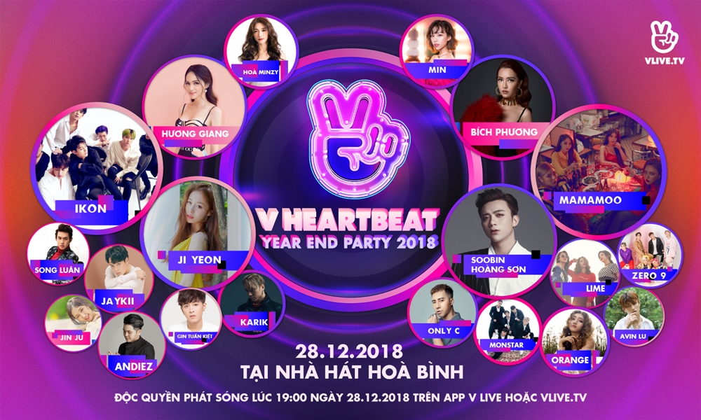 V HeartBeat Year End Party 2018 sẽ diễn ra vào 19h ngày 28/12, tại Nhà hát Hoà Bình (TP.HCM) và được truyền hình trực tiếp vào 19h trên kênh VLIVE. Toàn bộ vé tham dự chương trình hoàn toàn miễn phí. Ngoài ra, một trong những điểm đáng chú ý của đêm nhạc đình đám này chính là lễ vinh danh và trao giải thưởng VLIVE Awards cho các ngôi sao đã đóng góp vào sự thành công của hệ thống kênh truyền hình giải trí trực tuyến này.