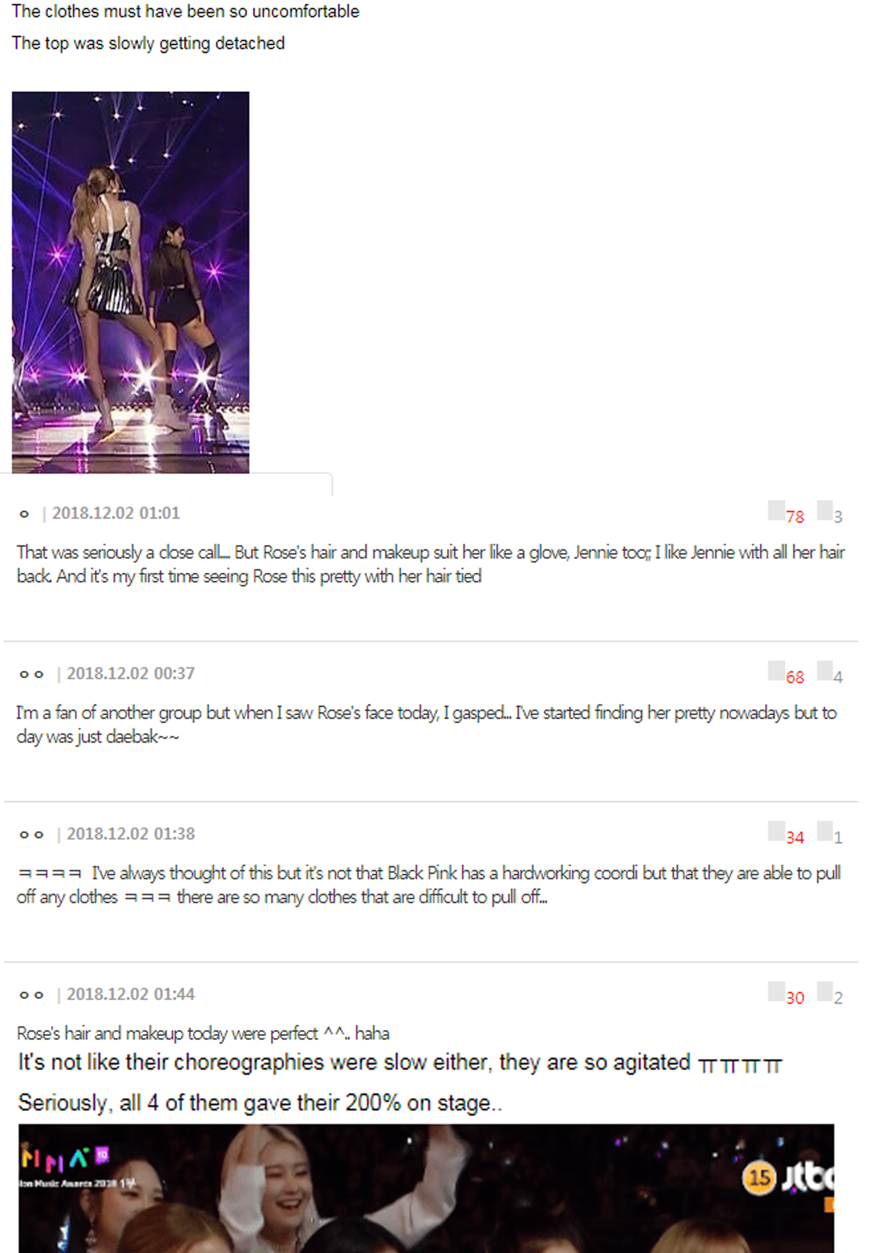 K-net đã hết sức cảm phục về khả năng xử lý tình huống của Rosé trong trường hợp này. Họ nói: 'Khả năng cân mọi trang phục của Rose đúng là không phải dạng vừa… Cái áo thế này còn mặc đẹp nữa mà', “Đúng là hú hồn… Nhưng cách trang điểm và làm tóc rất hợp với Rose, cả Jennie nữa. Mị thích Jennie vén hết tóc ra đằng sau thế kia. Với cả đây là lần đầu tiên mị thấy Rose buộc tóc xinh như vậy', 'Là fan của nhóm khác mà tui cũng phải há hốc mồm trước nhan sắc của Rose… Dạo này đã thấy bạn ấy xinh rồi nhưng hôm nay đúng là đỉnh kout luôn',…