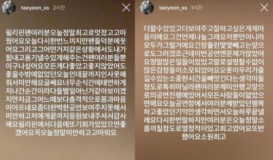 Nội dung đoạn chia sẻ trên story Instagram của Taeyeon như sau: “Gửi tới tất cả người hâm mộ của mình ở Philippines, hôm nay các bạn là những người tuyệt vời nhất, và mình rất biết ơn các bạn. Mình lại nhận ra một điều rằng, là mình có thể mỉm cười là nhờ vào các bạn fan của mình. Và cho dù đang ở trong tình huống tệ hại nào, mình vẫn có được sức mạnh và lòng can đảm nhờ vào các bạn”.